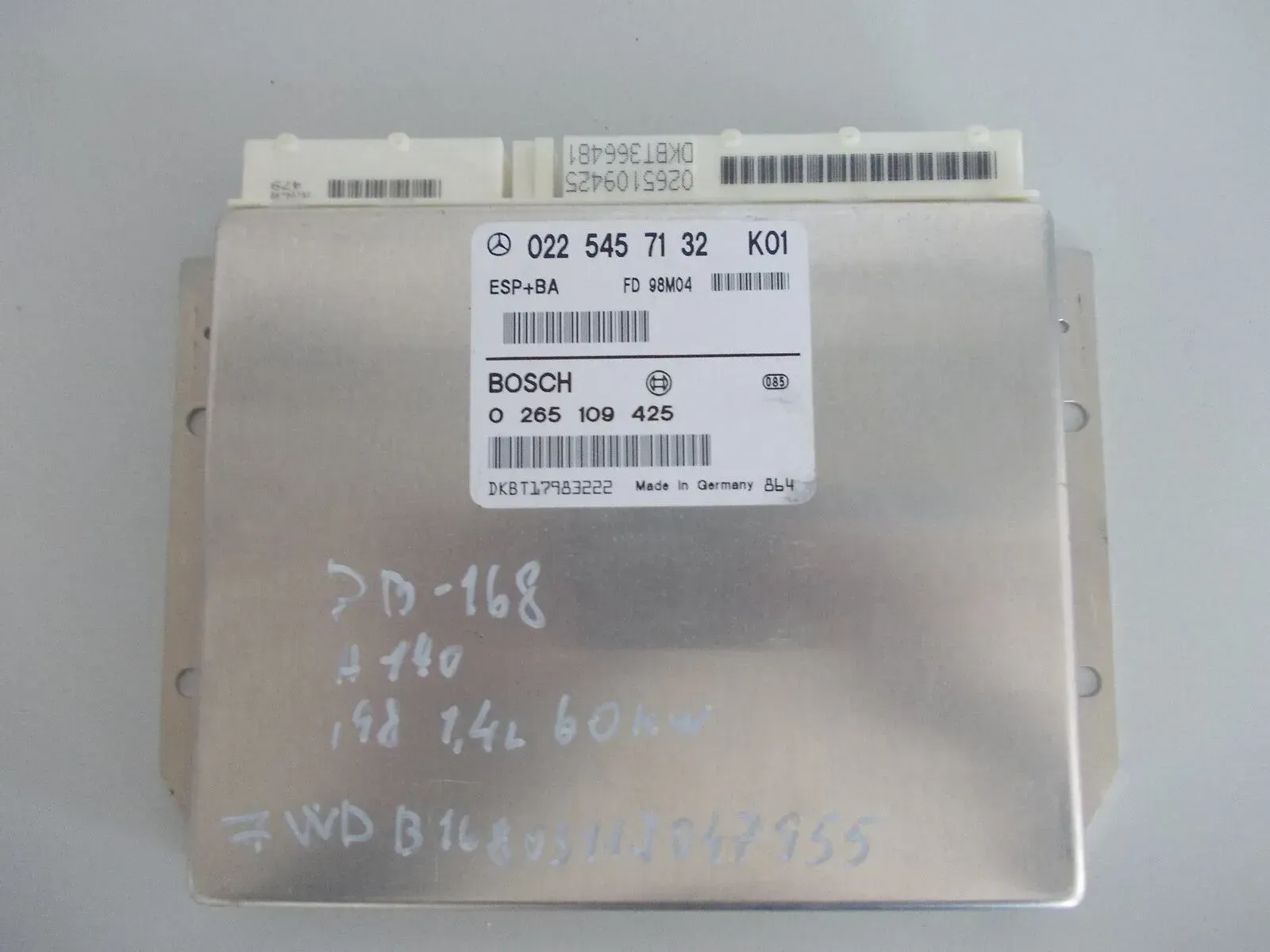 Mercedes Benz W168 A-Klasse Steuergerät Marke: Mercedes Benz Typ: W168 Fahrgesttelnummer: WDB1680331J055199 Baujahr: 1998 Leistung: 1,4l / 60kw Laufleistung: ca.127.000km Teilenummer: Mercedes: 022 545 71 32 Bosch: 0 265 109 425 WICHTIG! BITTE VERGLEICHEN! s. auch Bild TEILENUMMER MUSS KOMPLETT ÜBEREINSTIMMEN! Interne Nummer: LS-13177 Besuchen Sie unseren eBay Shop: Autoverwertung-Ellar Telefonische Auskunft bitte nur während unseren Öffnungszeiten! Öffnungszeiten: Mo. – Fr. 9.00 – 18.00 Sa. 9.00 – 14.00 Sonn. – und Feiertage geschlossen! Tel. Nr.: